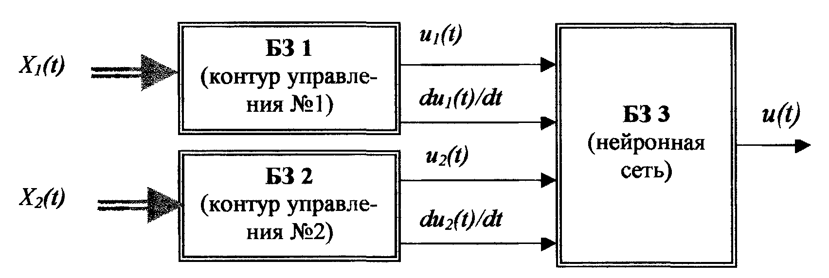 Б31 и Б32 должны быть построены до того, как настраивается БЗЗ, представляющая собой нейронную сеть прямого распространения. Она решает уже полную задачу управления, но получает на вход не многокомпонентный вектор X, а всего 4 переменные (для рис. 1).